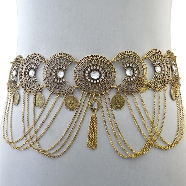 Women Belly Dance Belt Waist Metal Crystal Coin Tassel Body Chain Jewelry