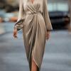 New Elegant Cross Neck Gathered Waist Slit Puff Sleeve Irregular Long Sleeve Dress for Women
